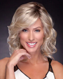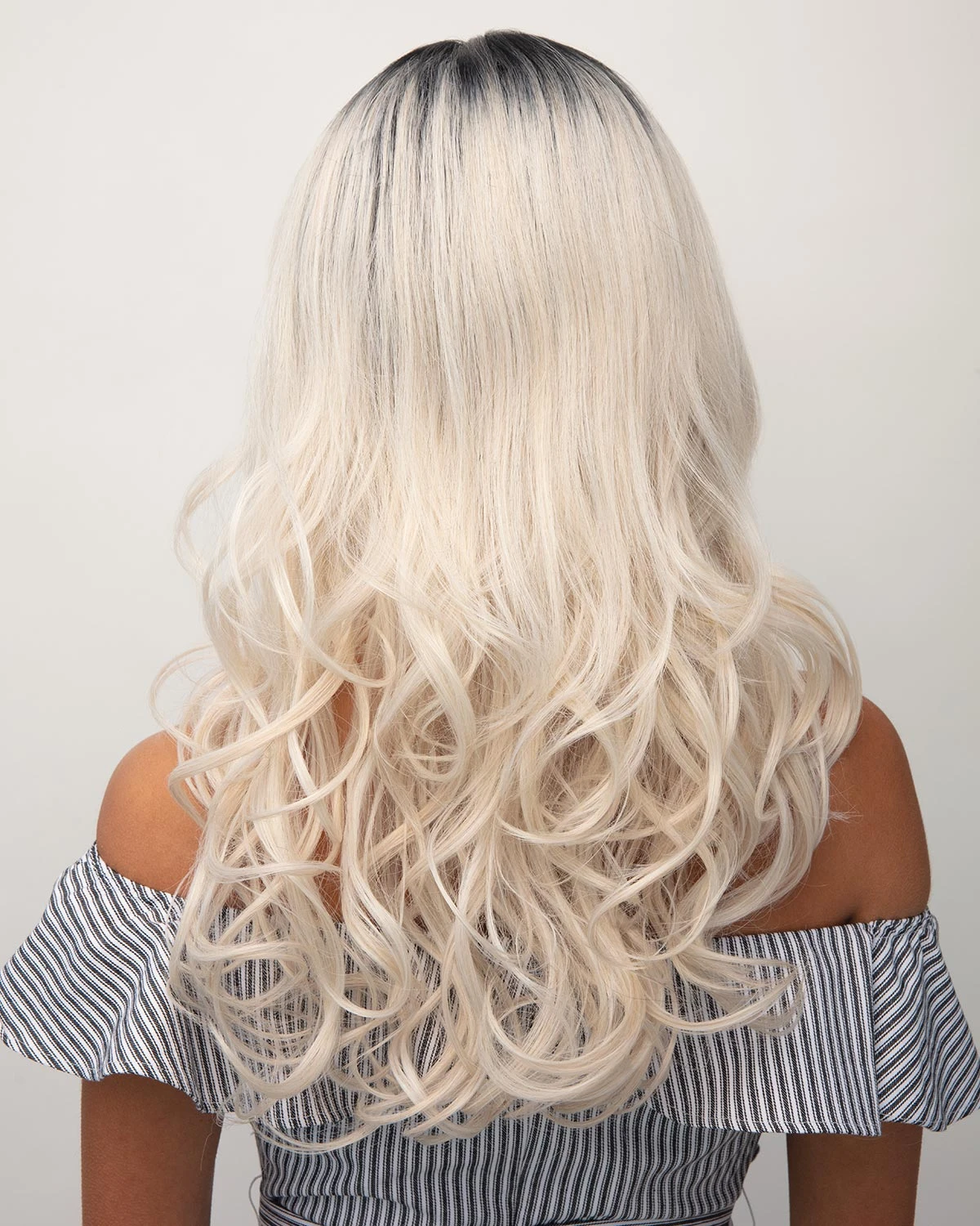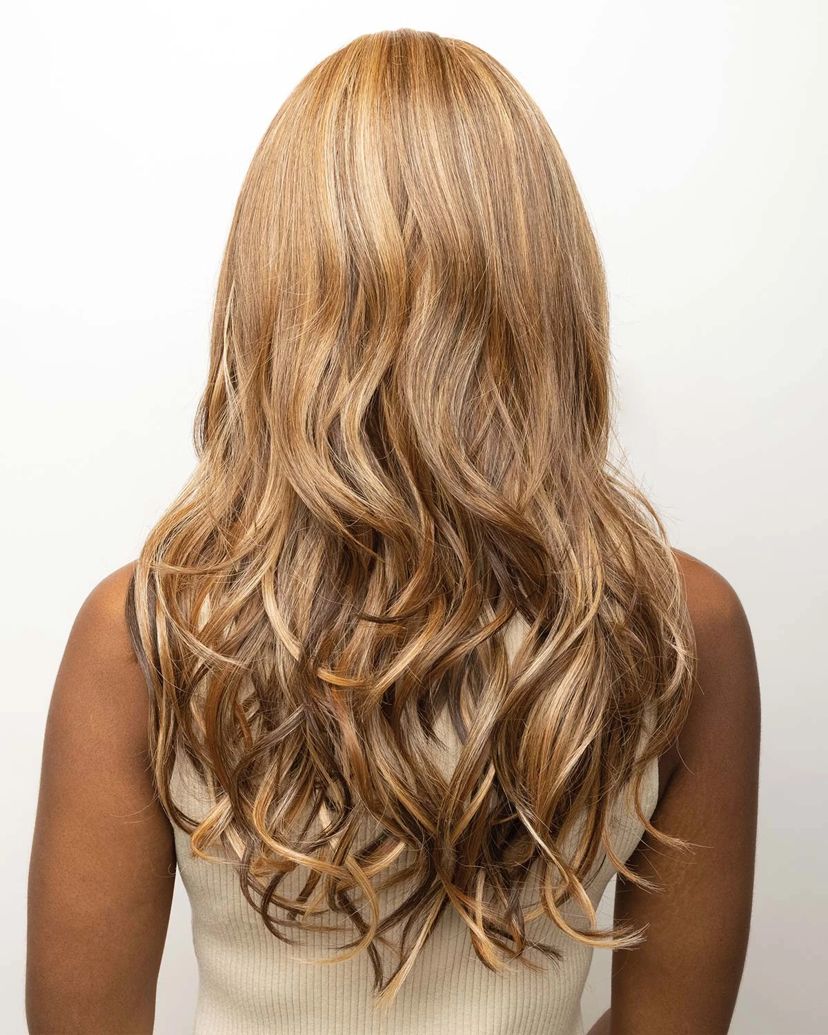Curvaceous loose curls that fall mid-back will surely turn heads. Featuring crown skin top cap.
