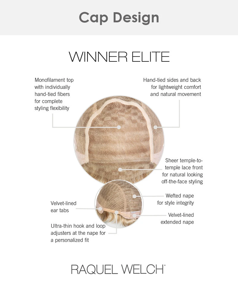 Winner Elite by Raquel Welch is a pixie with barely waved layers that are perfect for every occasion. Loved for its simplicity, Winner offers a wispy bang, textured layering on top with length at the crown and layered ends. The tapered neckline has a touch of length, giving you coverage where you need it most. The ready-to-wear synthetic hair looks and feels like natural hair. This Elite version of Winner also features a 100% hand-tied cap, Sheer Indulgence lace front, and monofilament top. These features create supremely natural comfort and movement, a natural-looking hairline, and the appearance of natural hair growth. With a firm shake right out of the box, this short boy cut is as easy to style as it is comfortable to wear! And it weighs in just under two ounces.